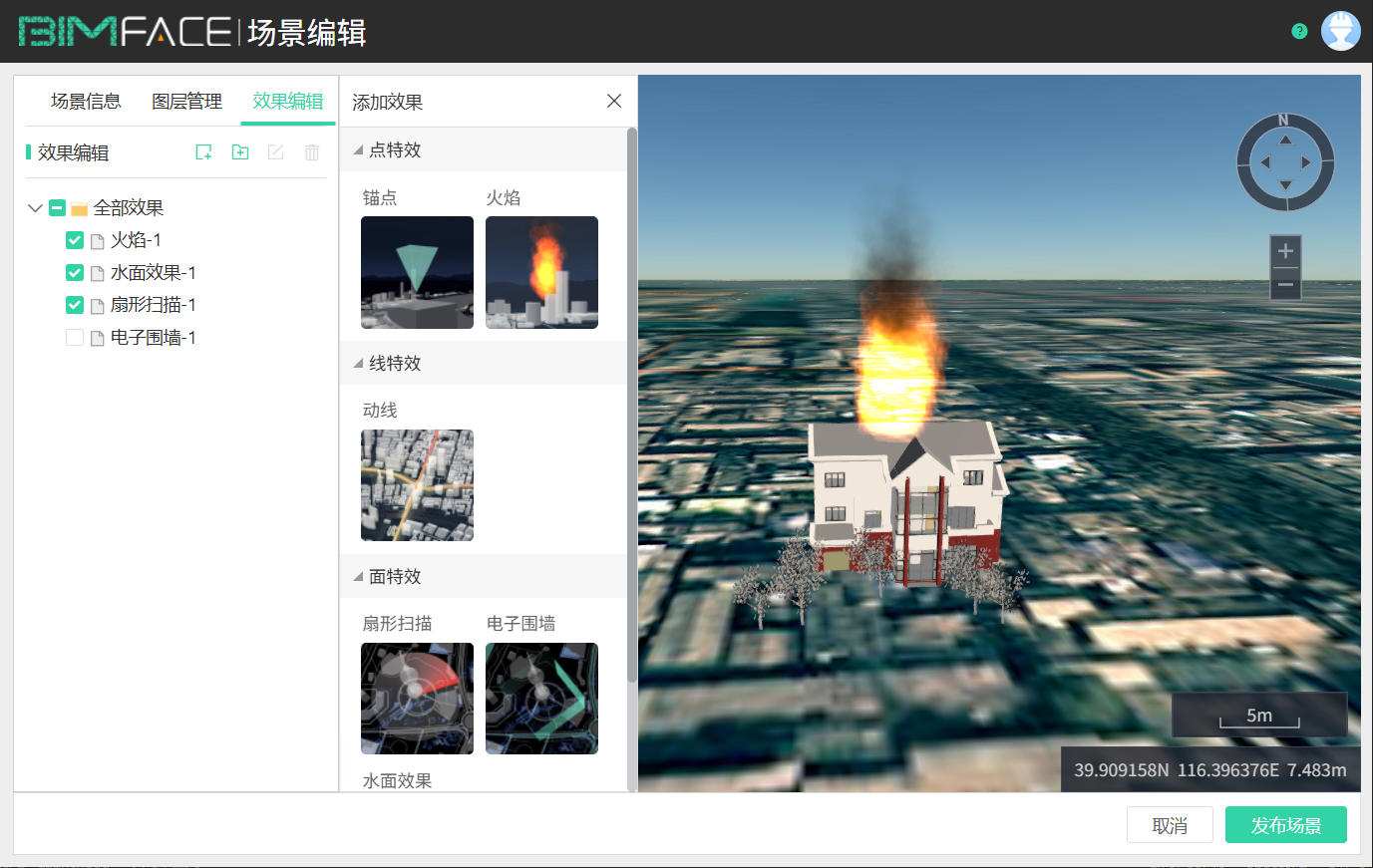 - 球体场景编辑-效果编辑模块,支持基于简单交互添加环状扫描效果,场景发布后效果数据将一并保存,场景预览时也支持对添加的效果进行显隐控制。